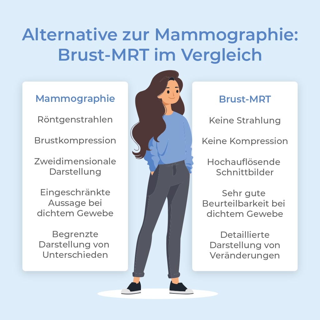 Ob die Brust-MRT als Ergänzung oder als Alternative zur Mammographie infrage kommt, entscheidet stets das ärztliche Gespräch unter Berücksichtigung der individuellen Situation.