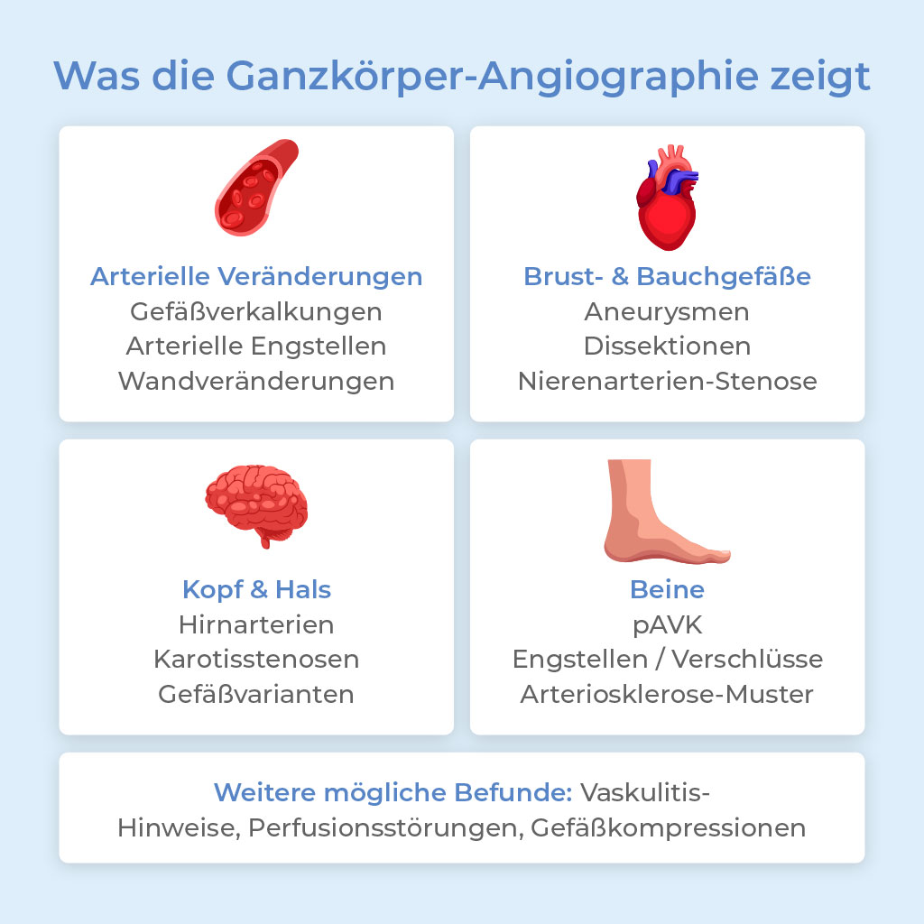 Für die Vorsorge entsteht daraus ein deutlicher Vorteil: Die Ganzkörper Angiographie zeigt nicht nur, wie das Blut fließt, sondern auch, in welchem strukturellen Zustand die Gefäße arbeiten.